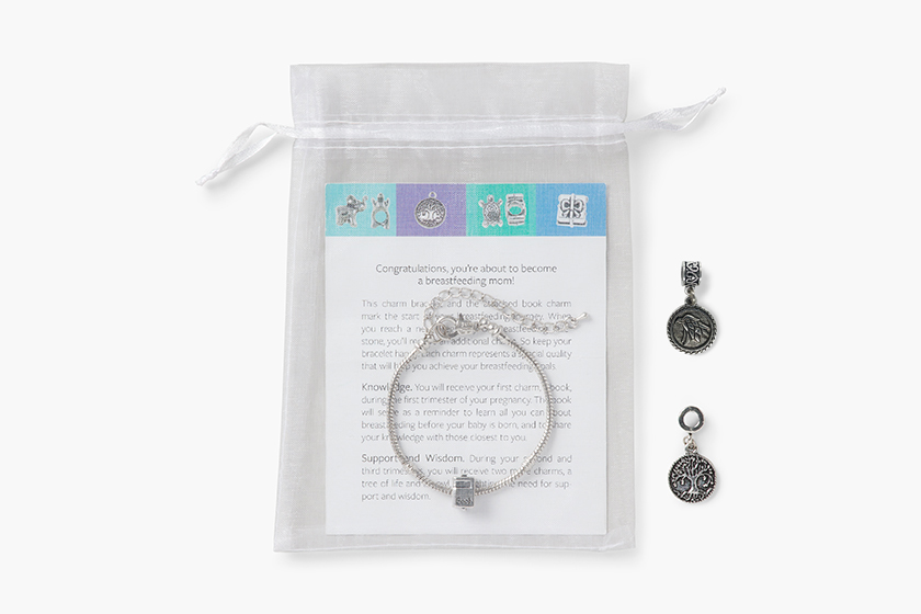 Each starter kit contains a bracelet, three charms, and a congratulations card that explains the meaning of each charm. Moms are given a bracelet with a Book charm attached during their first trimester, a Tree of Life charm during their second trimester, and either an Owl or Eagle charm during their third trimester.